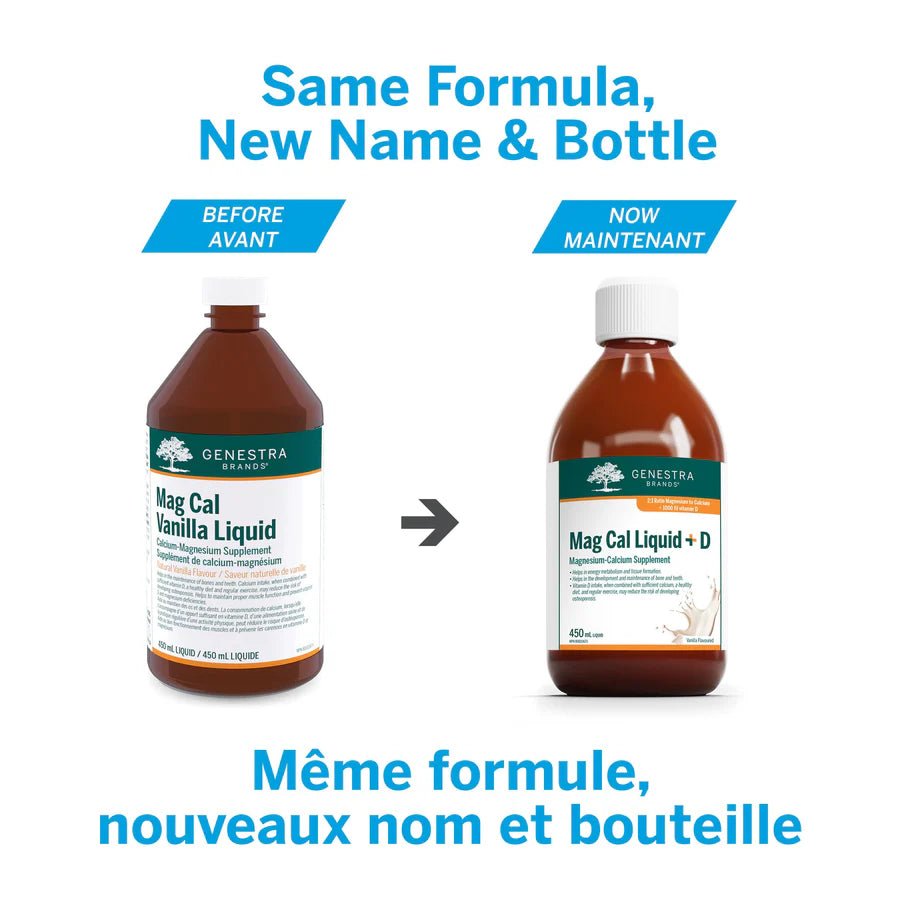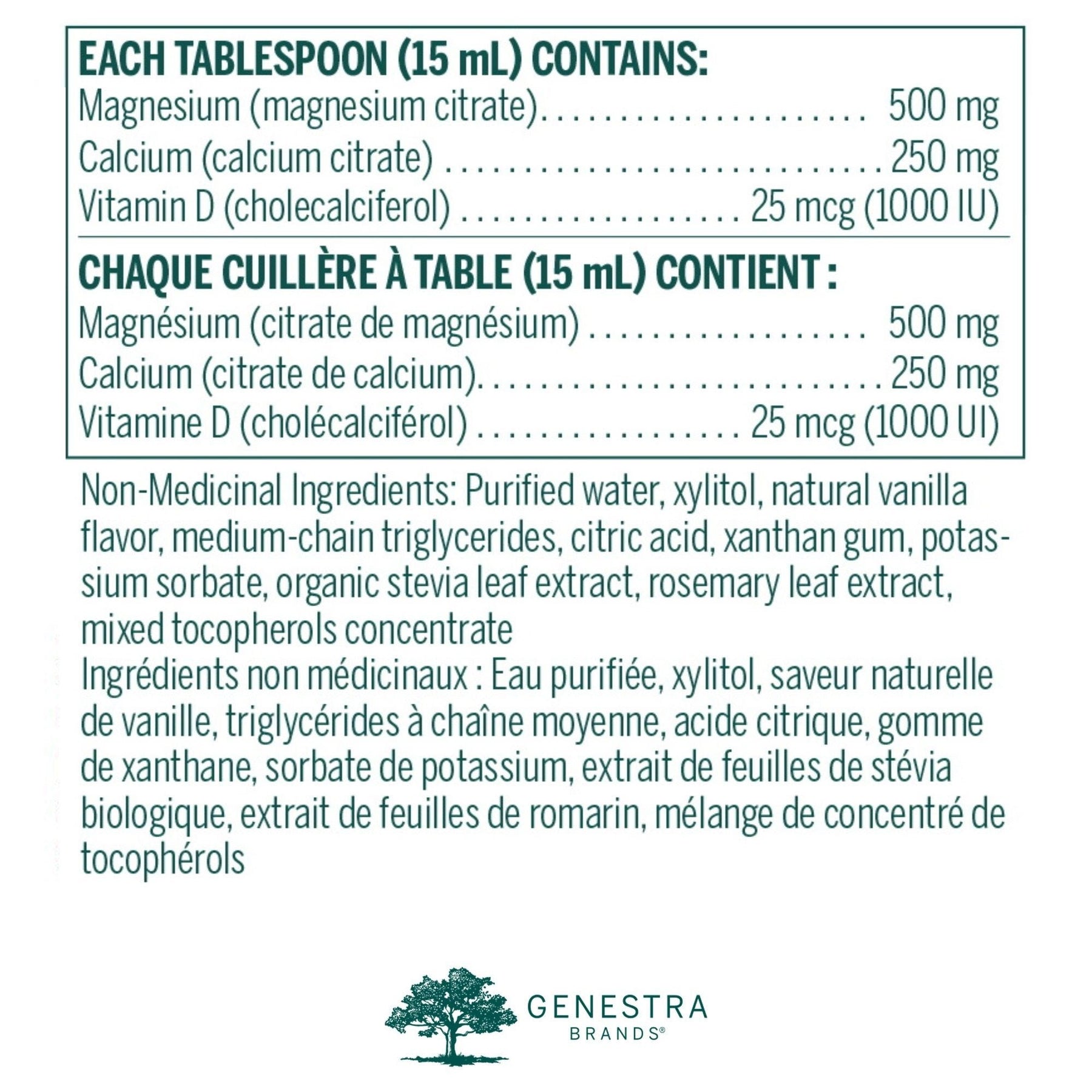 EACH TABLESPOON (15 mL) CONTAINS: Magnesium (magnesium citrate) ..................... 500 mg Calcium (calcium citrate) ............................ 250 mg Vit amin D (cholecalciferol) .................. 25 mcg (1 000 IU) Non-Medicinal Ingredients: Purified water, xylitol, natural vanilla flavour, medium-chain triglycerides, citric acid, xanthan gum, potassium sorbate, organic stevia leaf extract, rosemary leaf extract, mixed tocopherols concentrate